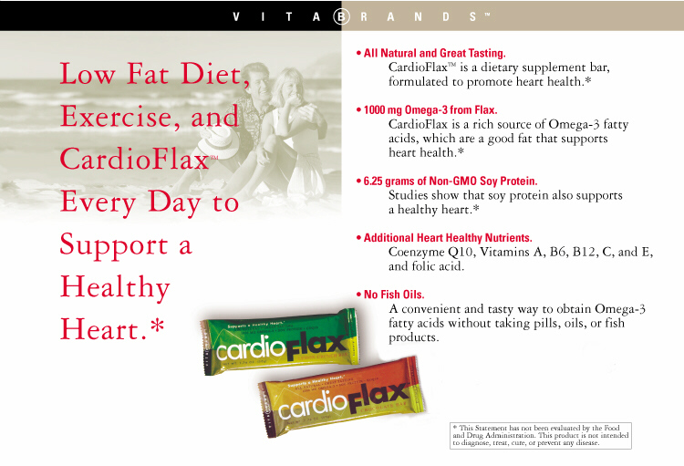 Contact us at Phone: 310-496-3033 or Email:sales@cardioflax.com Click Here to Submit a Message to us via a Web Page Form ©Copyright 2001, VitaBrands, All Rights Reserved. CardioFlax is Patented Pending